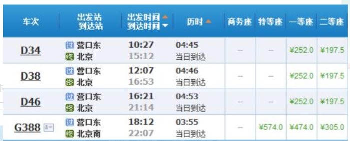 遼寧營口到北京每天4趟車,首末班時間為10點27分和18點12分,耗時3小時55分鐘到4小時53分鐘,動車二等座票價197.5元,高鐵二等座票價305元。