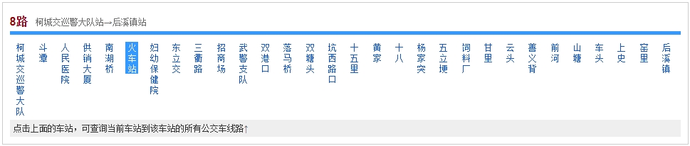 柯城交巡警大隊 - 斗潭 - 人民醫院 - 供銷大廈 - 南湖橋 - 火車站 - 婦幼保健院 - 東立交 - 三衢路 - 招商場 - 武警支隊 - 雙港口 - 落馬橋 - 雙塘頭 - 坑西路口 - 十五里 - 黃家 - 十八 - 楊家突 - 五立埂 - 飼料廠 - 甘里 - 云頭 - 善義背 - 前河 - 山塘 - 車頭 - 上史 - 窯里 - 后溪鎮