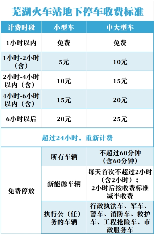 1、小型車:1小時以內為免費停車時段,1小時-2小時(含)收費標準為5元,2小時-4小時以內(含)收費標準為10元,4小時-6小時以內(含)收費標準為15元,6小時以后收費標準為20元,超過24小時,重新計費。