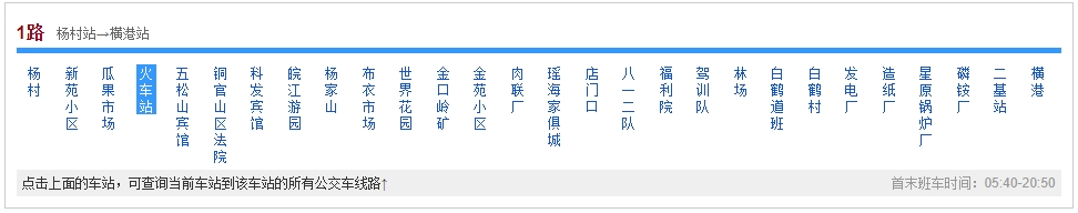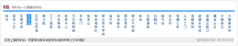 楊村 - 新苑小區 - 瓜果市場 - 火車站 - 五松山賓館 - 育才路 - 工人醫院 - 市體育館 - 電教中心 - 萬花購物城 - 豐收門 - 楊家山 - 有色地質隊 - 職業技術學院 - 省汽貿 - 銘浩制衣 - 固定駕校 - 順達汽貿城 - 林場 - 白鶴道班 - 白鶴村 - 儲氣站 - 古圣村 - 海螺公司 - 山水之門 - 海螺新線 - 新建鄉政府 - 新建岔路口 - 瀾溪山莊 - 大通新區 - 大通鎮政府