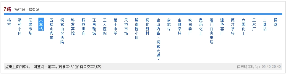 楊村 - 新苑小區 - 瓜果市場 - 火車站 - 五松山賓館 - 銅官山區法院 - 科發賓館 - 皖江游園 - 楊家山 - 布衣市場 - 世界花園 - 金口嶺礦 - 金苑小區 - 肉聯廠 - 瑤海家俱城 - 店門口 - 八一二隊 - 福利院 - 駕訓隊 - 林場 - 白鶴道班 - 白鶴村 - 發電廠 - 造紙廠 - 星原鍋爐廠 - 磷銨廠 - 二基站 - 橫港