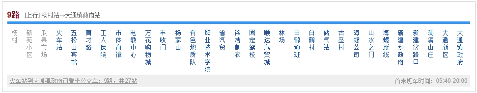 楊村 - 新苑小區 - 瓜果市場 - 火車站 - 五松山賓館 - 育才路 - 工人醫院 - 市體育館 - 電教中心 - 萬花購物城 - 豐收門 - 楊家山 - 有色地質隊 - 職業技術學院 - 省汽貿 - 銘浩制衣 - 固定駕校 - 順達汽貿城 - 林場 - 白鶴道班 - 白鶴村 - 儲氣站 - 古圣村 - 海螺公司 - 山水之門 - 海螺新線 - 新建鄉政府 - 新建岔路口 - 瀾溪山莊 - 大通新區 - 大通鎮政府