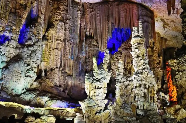 著名的溶洞景觀之一,洞內(nèi)石筍、石幔、石花等形態(tài)各異,加上燈光顏色變換的加持,仿佛進(jìn)入地下宮殿。地下河穿洞而過更給它增添了不少神秘感和探險的樂趣!