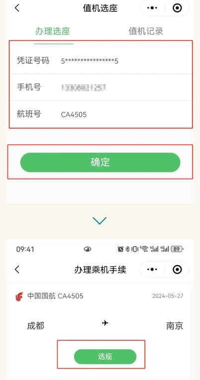 2、點擊“手機值機”,填寫憑證號碼、手機號和航班號,點擊下方“確定”,然后點擊“選座”。